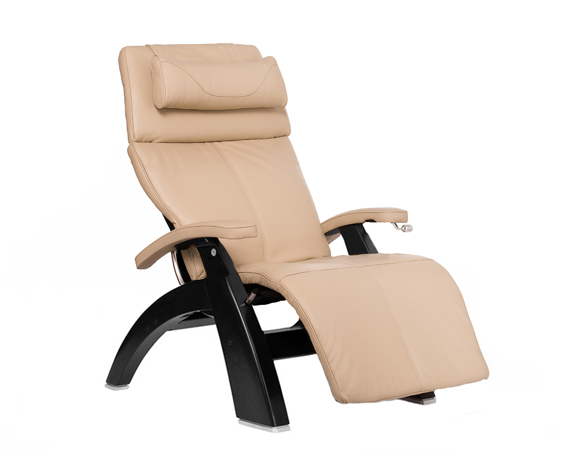 Ivory Premium Leather Matte Black Wood Base PC-420 Manual Recline Series 2 Perfect Chair Zero Gravity Recliner by Human Touch - Includes a Human Touch 7 Year In-Home Parts and Labor Warranty for New Perfect Chairs. The zero gravity position cradles your back and elevates your legs above your heart, which is the position that doctors recommend as the healthiest way to sit. Easy ingress and egress are achieved with the extended range of motion in the upright position. Exclusive Features Patented Orthonomic™ body frame with built-in lumbar curve. Extra wide legrest provides maximum comfort. The hand carved and finished base is pleasing to the eye, and constructed for years of use. The brake control system is easy to use and extremely reliable. Wedge-shaped, adjustable headrest cushion provides comfort for your head and neck. The adjustable headrest feature allows you to customize the optimum angle of comfort to maximize neck support while reading or watching television (Available on NEW and select Refurbished Chairs). Exclusive guide rail system for smooth recline motion and position control. Refurbished Chairs include a manufacturer's 90 Day Parts Limited Warranty*. New Perfect chairs include a manufacturer's 3 year limited warranty*. For a Power Electric Recline Version please see the PC-600 or PC-610 Omni-Motion Perfect Chair