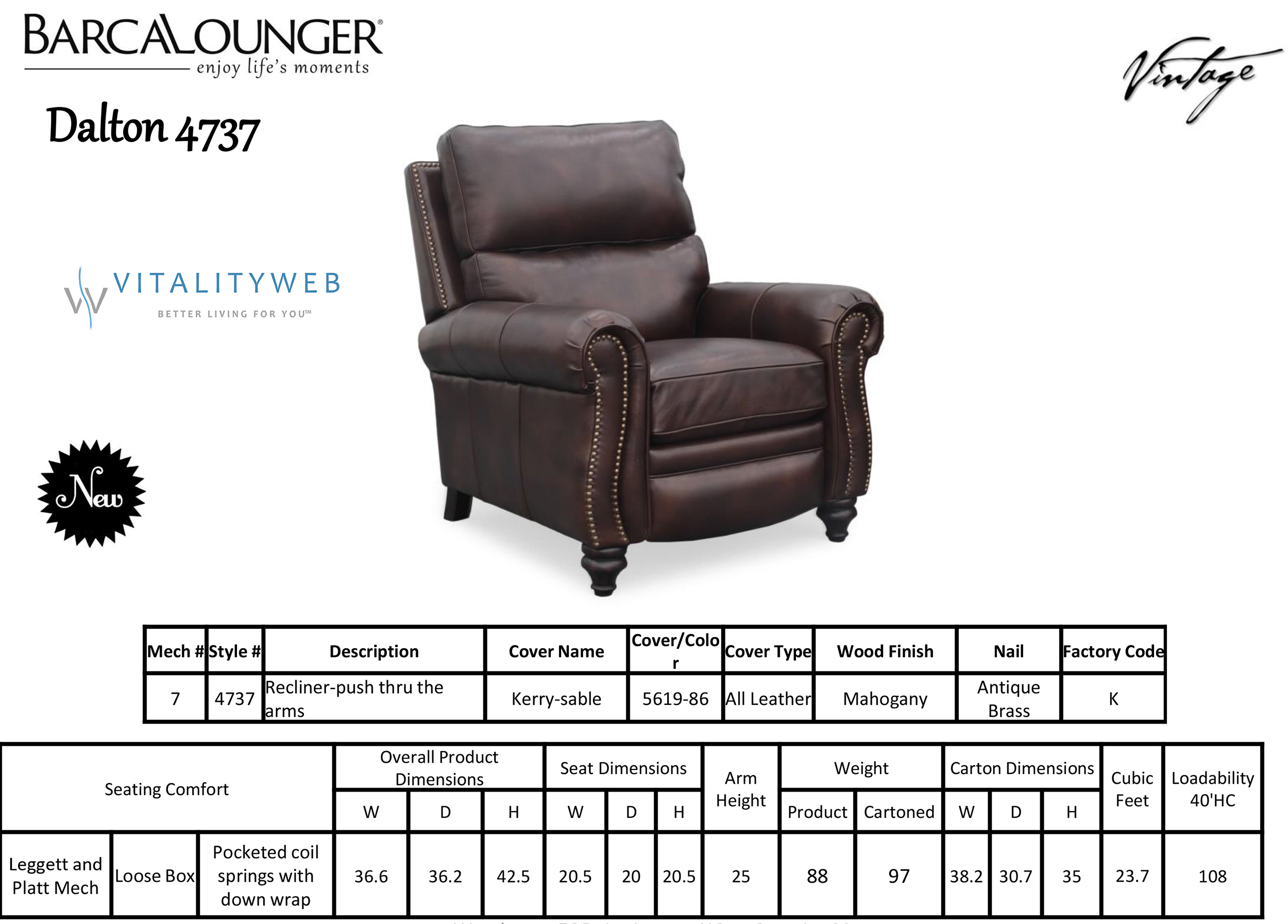 Barcalounger Dalton II Leather Recliner Lounger Chair. The Dalton recliner is an outstanding design with elements that are timeless. The bombay arm, trimmed with decorative nails accented with stylish turned legs will add comfort and beauty to the family room. The popular boxed seating, and pub back along with the high quality leather will provide many years of relaxing comfort for your home. Features: Recliner Leggett and Platt Activated not operated,Mechanisms bolted to frame with I bolts, 1.8 Resilency Foam, delrin bushings on all mechanisms, padding on backs and sides of all chairs Leathers or Fabrics feature distinctive design and luxurious feel. 30 Superior individual pocketed coils in each seat cushion , fully enclosed in fabric, the foam is topped with blended down feathers. High resilence seat foam for superior durability and comfort. Color: