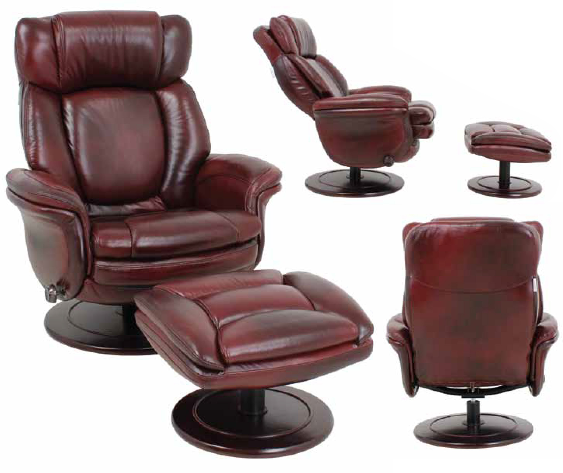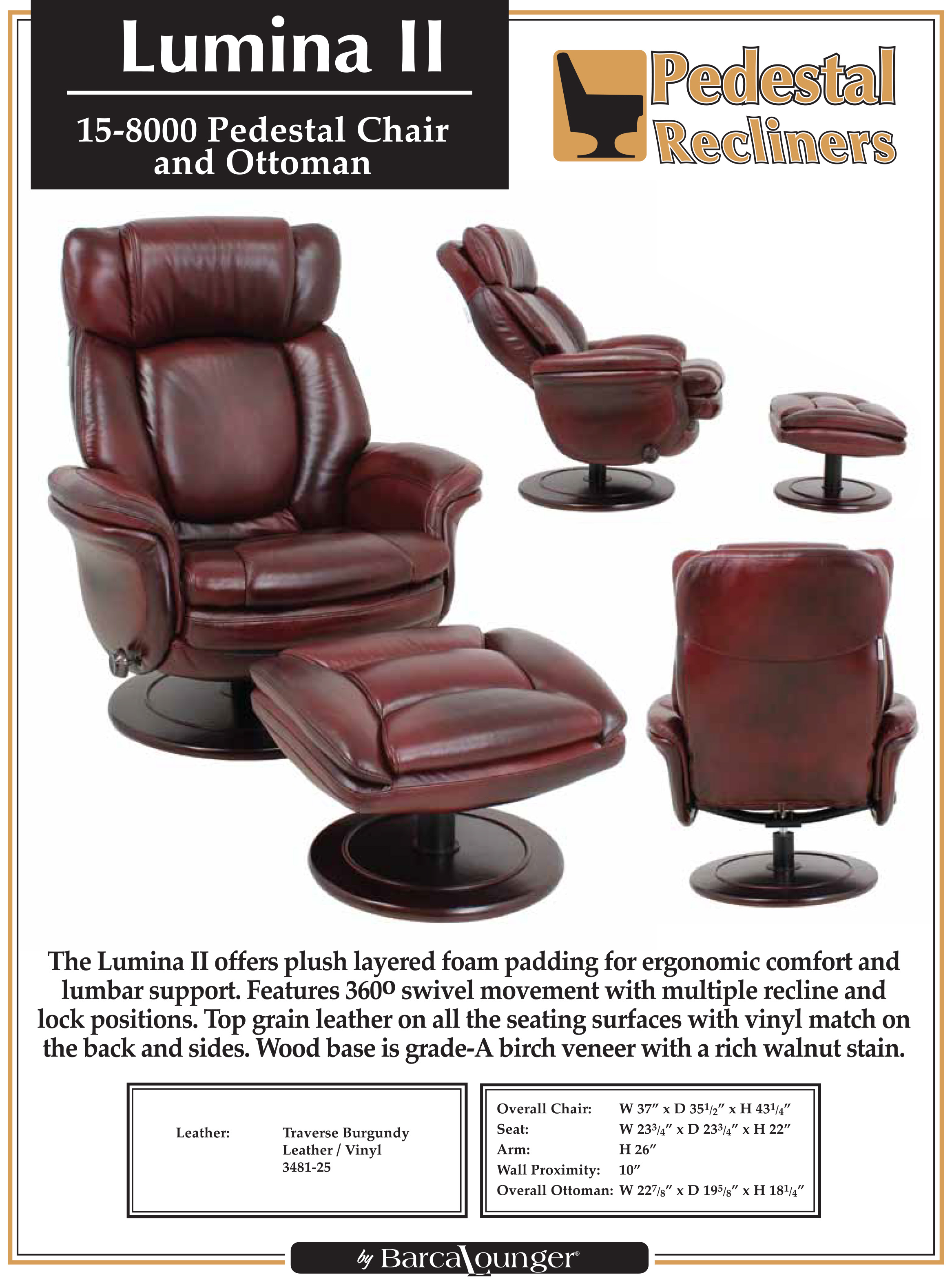 with Traditional Recline If you prefer more contemporary seating or do not like the look of traditional recliners, then the Barcalounger Lumina II pedestal chair and ottoman might be for you. The design features Traverse Burgundy top grain leather on all the seating surfaces and vinyl match on the back and sides. Paired with a Regency Walnut stain wood base, this chair provides comfortable seating for the modern living space. Features include a 360 degree swivel with multiple recline and lock positions. The matching ottoman contours to the underside of your legs and the back provides excellent lumbar support. Colors:
