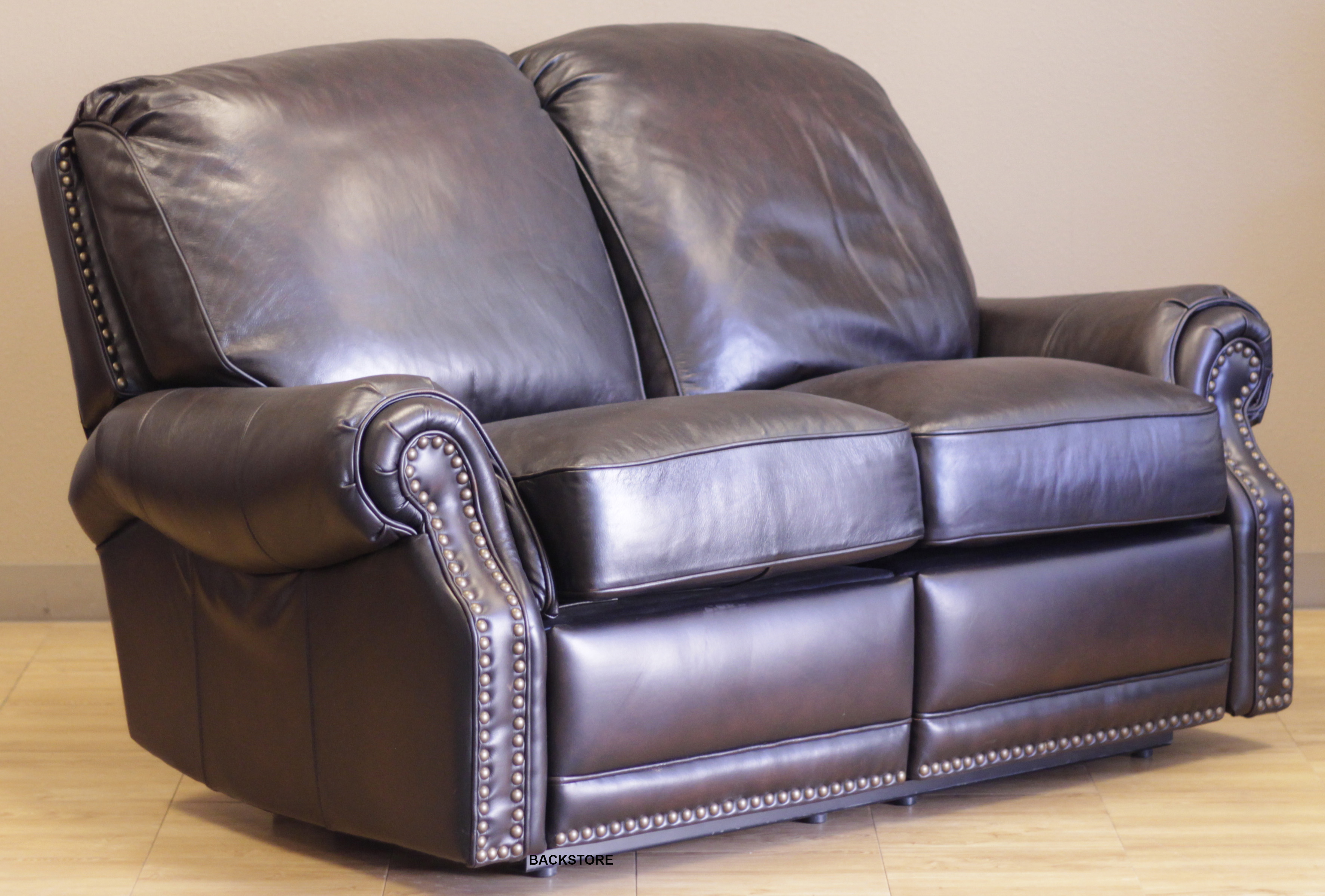Barcalounger Premier II Power Recline Leather Sofa - 100% Top Grain Leather genuine leather on all sides, even underneath, for a fully finished look. Brass Nail Heads. Barcalounger The Premier Collection features classic elegance and timeless styling. The beautiful hand rubbed leather, coil and down blend cushion and loose adjustable solid back pillow provide premium comfort. All these plush features are enhanced with designer nail head trim. Select from Manual or Power Recline Models. Colors: |