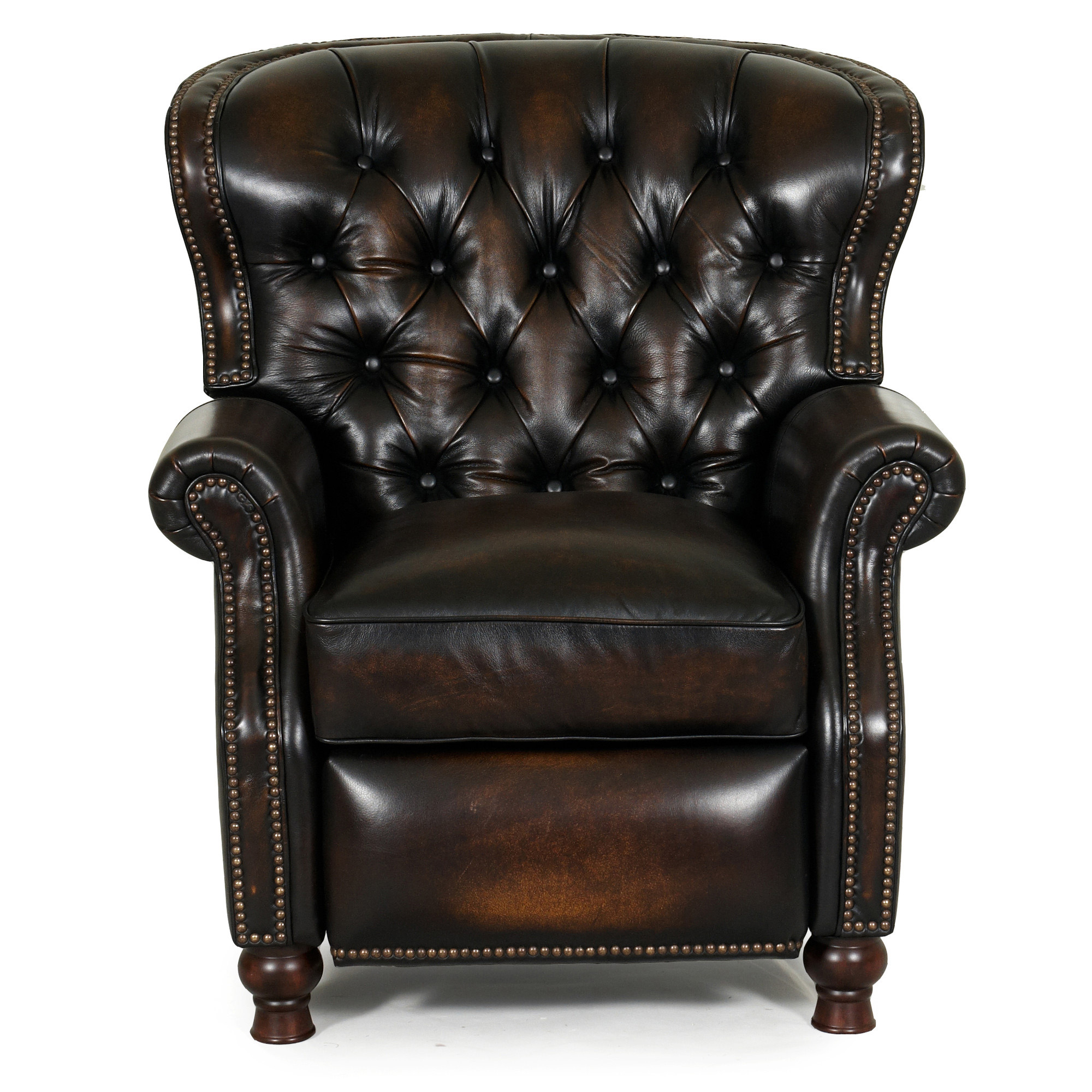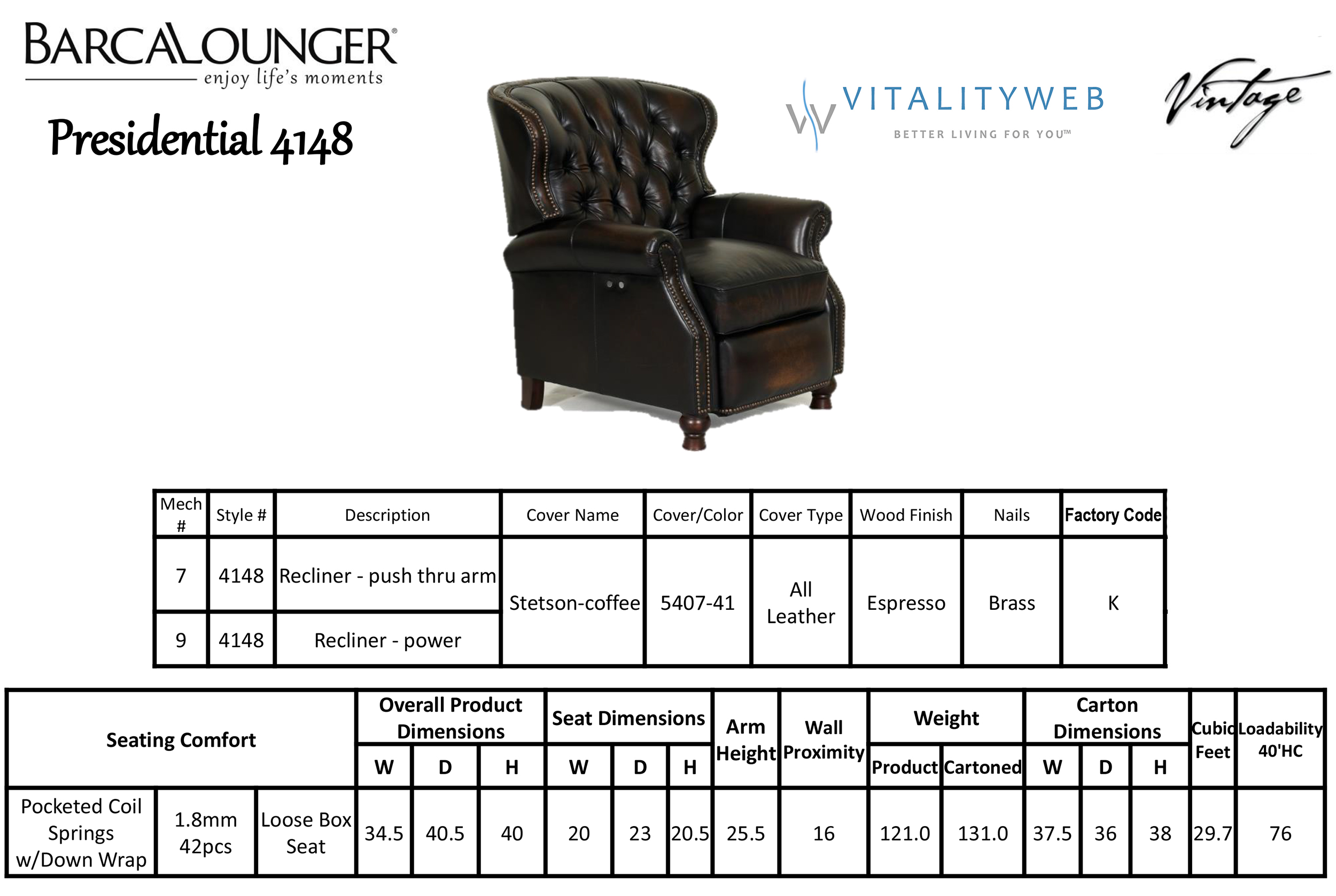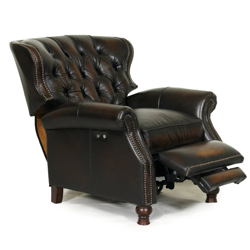 Barcalounger Presidential II Leather Recliner Lounger Chair - 100% Top Grain Leather. Available in a Manual or Power Electric Recline Version. The Presidential II features classic elegance and timeless styling with the comfort and beauty of deep button tufting, barrel back and accenting nail head trim. Top quality Leggett and Platt reclining mechanism is easily activated by leaning into chair back; unit requires only 2.5 lbs of pressure to open. Mechanism has plastic delrin bushings for silent, squeak-free operation and is secured to the recliner with metal bolts and t-nuts, for increased stability and durability. Mechanisms bolted to framewith I bolts, 1.8 Resilency Foam, padding on backs and sides of all chairs. Hardwood and Plywood Frames with Mortise and tenion glued joints. Leathers or Fabrics feature distinctive design and luxurious feel. 30 Superior individual pocketed coils in each seat cushion , fully enclosed in fabric, the foam is topped with blended down feathers High resilence seat foam for superior durability and comfort.