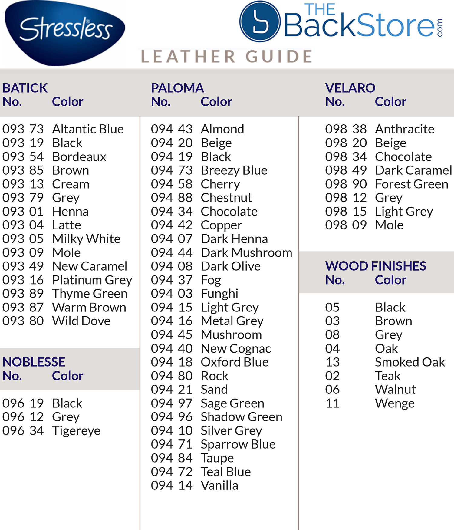 Production Stressless Leather Grade and Color Guide: