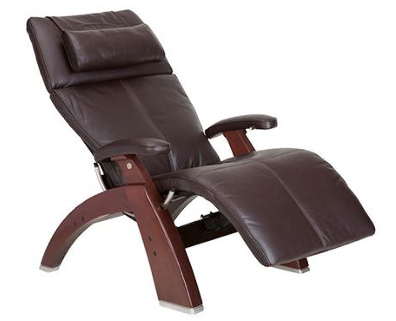Espresso Premium Leather Chestnut Wood Base Series 2 Perfect Chair Zero Gravity Power Recliner by Human Touch - The zero gravity position cradles your back and elevates your legs above your heart, which is the position that doctors recommend as the healthiest way to sit. Easy ingress and egress are achieved with the extended range of motion in the upright position. Exclusive Features Patented Orthonomic™ body frame with built-in lumbar curve. Extra wide legrest provides maximum comfort. The hand carved and finished base is pleasing to the eye, and constructed for years of use. The brake control system is easy to use and extremely reliable. Wedge-shaped, adjustable headrest cushion provides comfort for your head and neck. The adjustable headrest feature allows you to customize the optimum angle of comfort to maximize neck support while reading or watching television (Available on NEW and select Refurbished Chairs). Exclusive guide rail system for smooth recline motion and position control. Refurbished Chairs include a manufacturer's 90 Day Parts Limited Warranty*. New Perfect chairs include a manufacturer's 3 year limited warranty*. Brand new Series 2 PC-600 Silhouette Omni Motion Power Perfect Chair Recliner, Series 2 PC-610 Omni Motion Power Perfect Chair Recliner, Series 2 Classic PC-500 Silhouette Power Perfect Chair Recliner, Series 2 Classic PC-510 Power Perfect Chair Recliner, Series 1 Classic PC-075 Silhouette Power Perfect Chair Recliner and Series 1 Classic PC-095 Power Perfect Chairs have a folding footrest to allow easier entry and exit from the chair. The Newest Series 2 PC-600 Silhouette Omni Motion Power Perfect Chair Recliner, Series 2 PC-610 Omni Motion Power Perfect Chair Recliner have a 5-Way Controller to give you maximum control of your Perfect Chair experience. With the New PC-600 and PC-610 you can now control the footrest independently of the backrest to give you even more positional control. See Pictures Here.