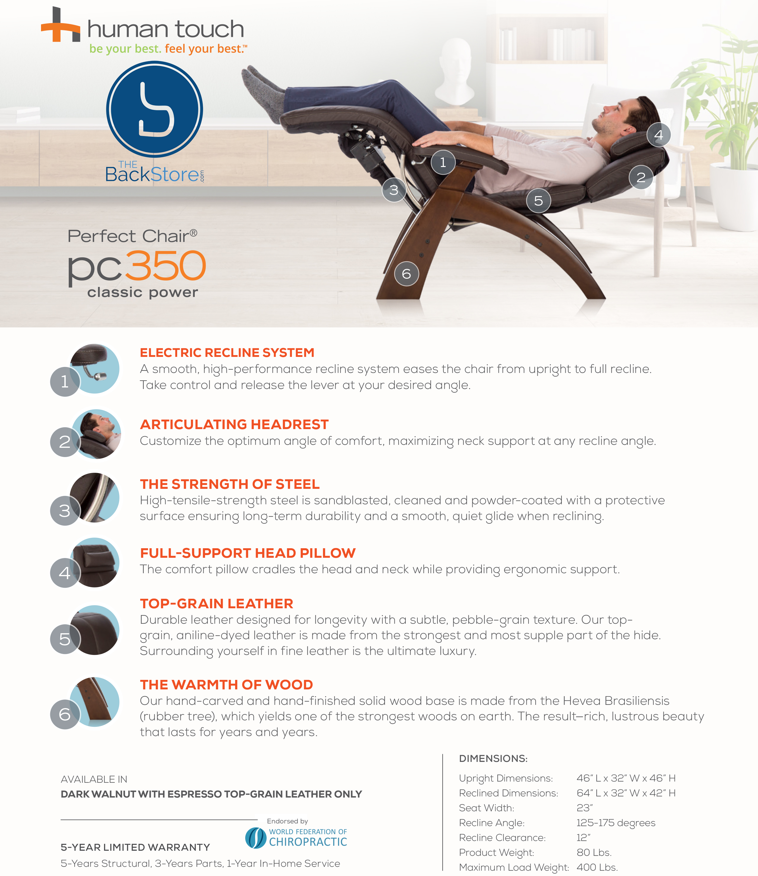 Material: Top Grain Genuine Leather - Dark Walnut Wood Stain
