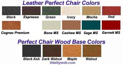 Note 1: Due to a special chair frame requirement, TouchSONIC® Perfect Chairs will be delivered in a single box from the factory in two predetermined upholstery/wood combinations (black/dark walnut & chocolate/dark walnut - both manual only), and are thus NOT color configurable.